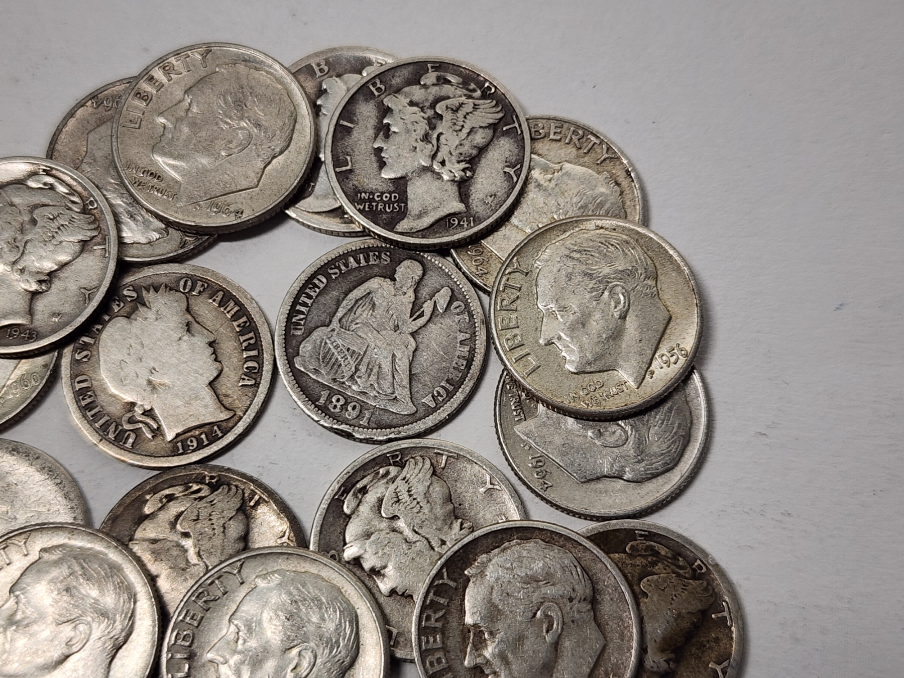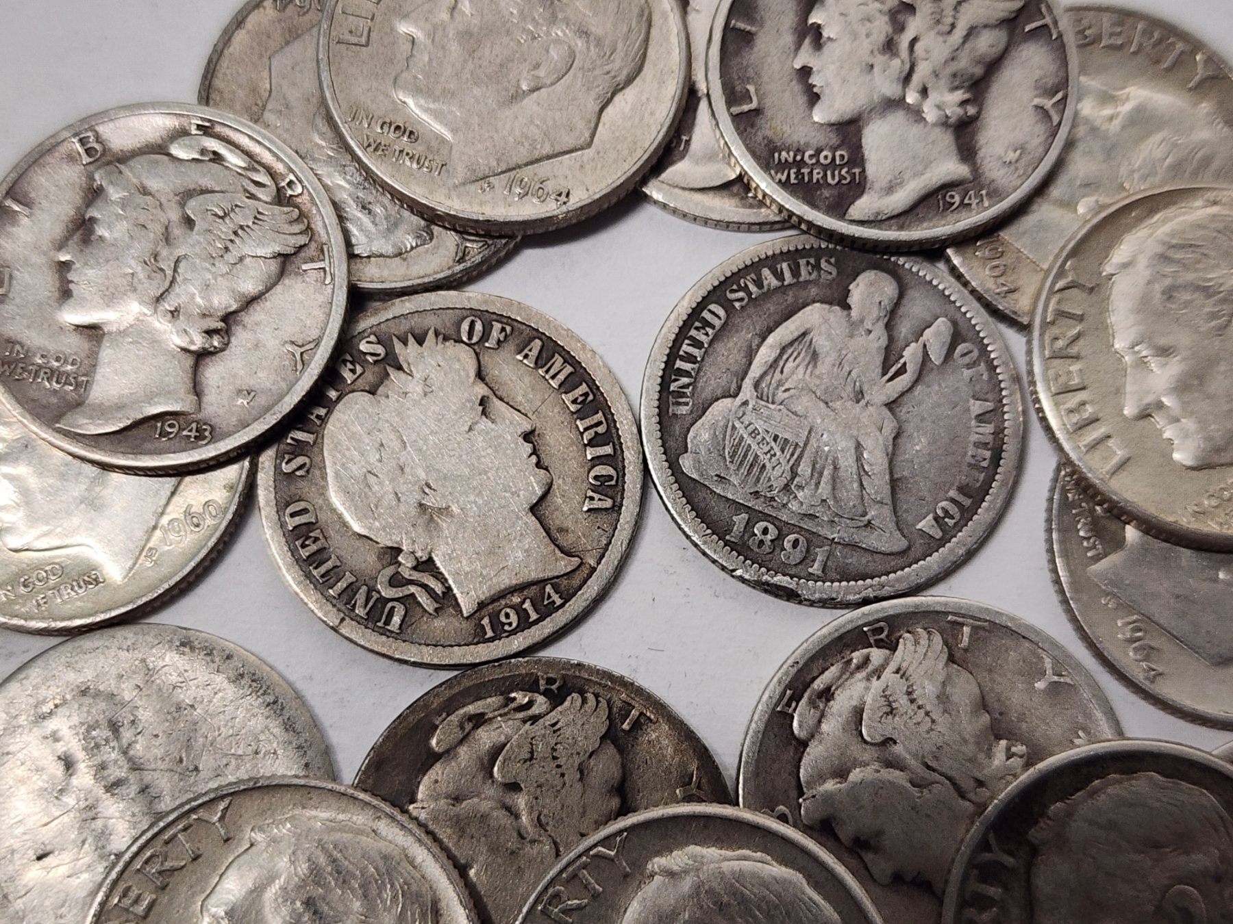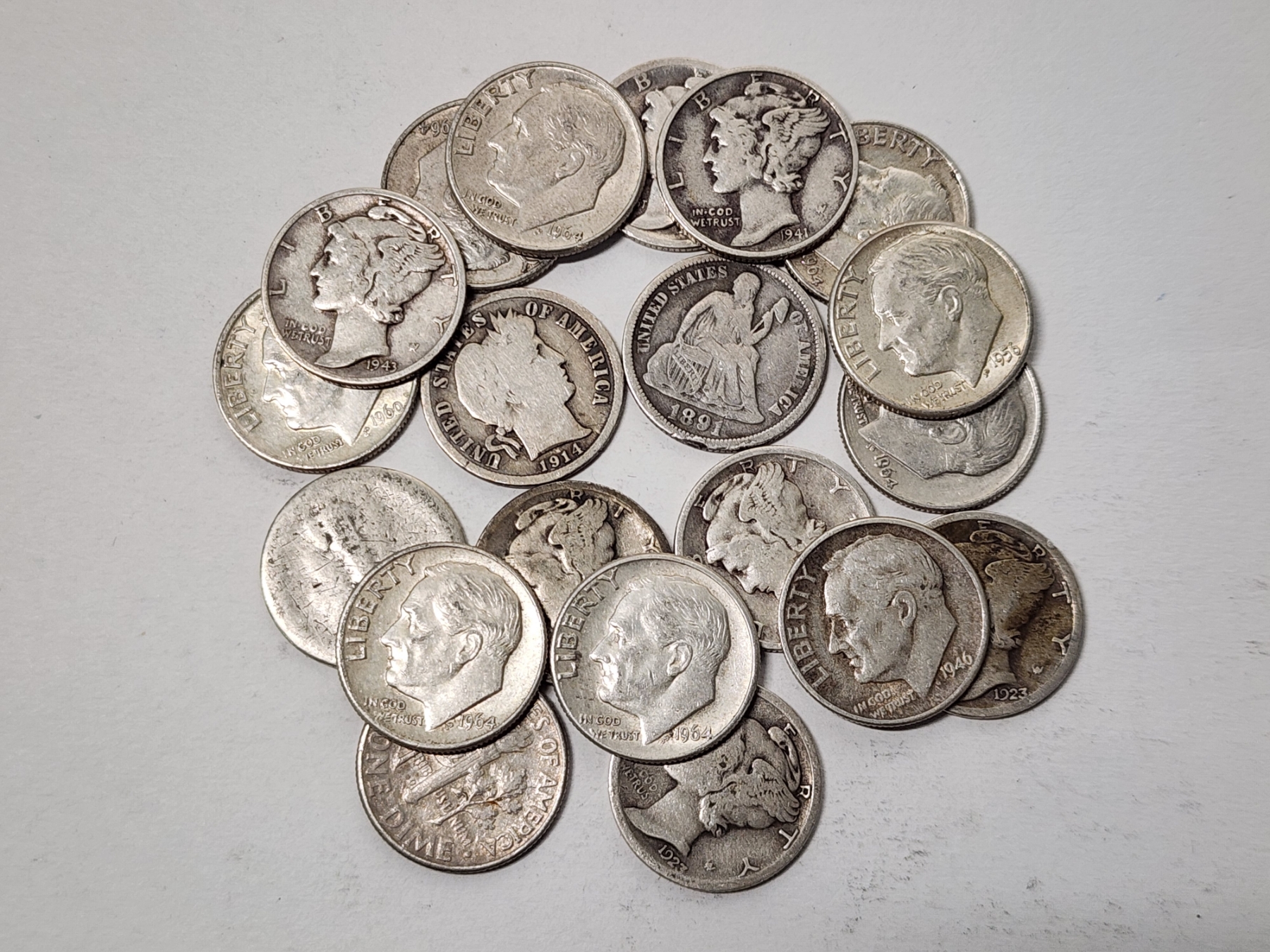 x20 Assorted U.S. 90% Silver Dimes: Seated Liberty, Barber, Mercury, Roosevelt FV: $2.00