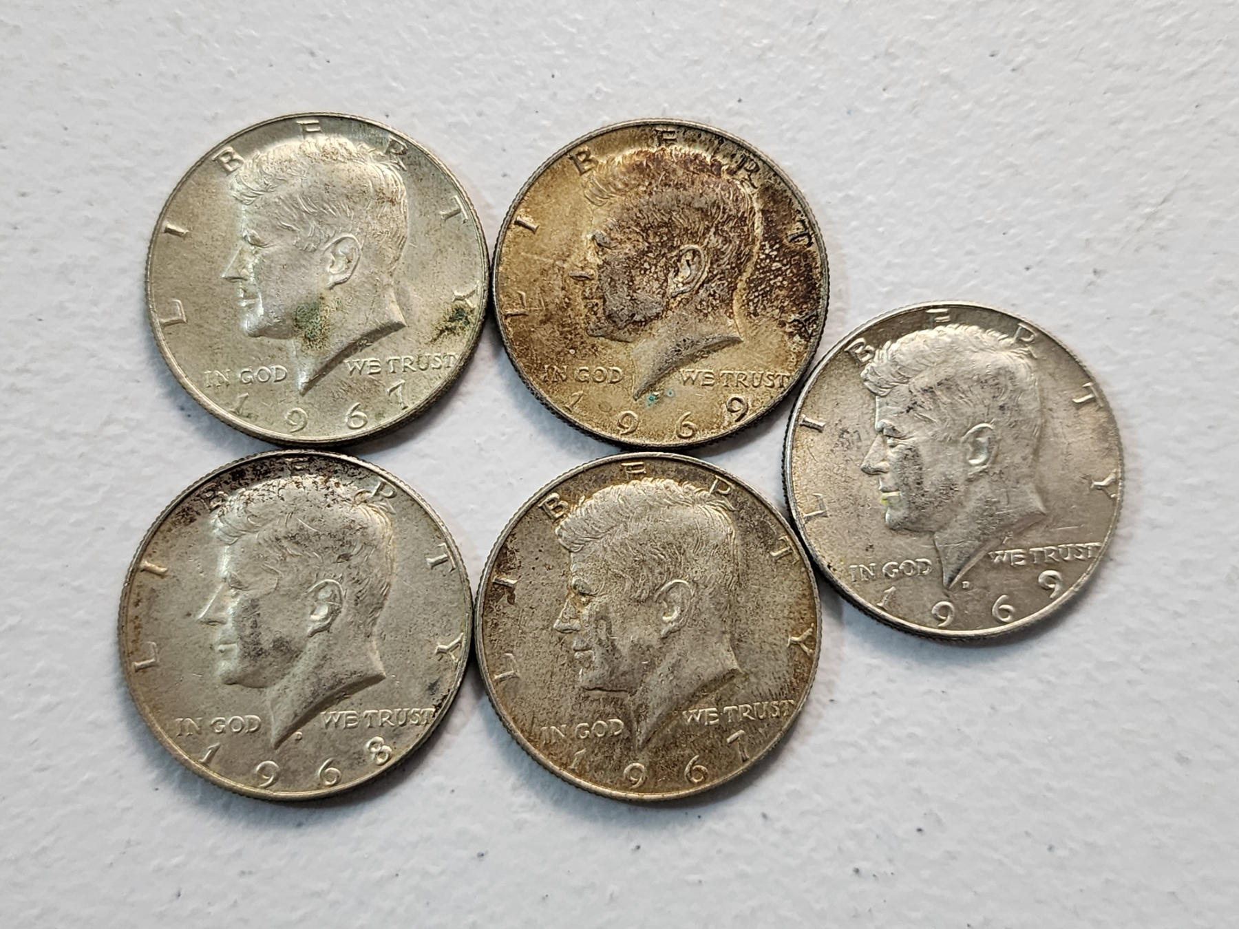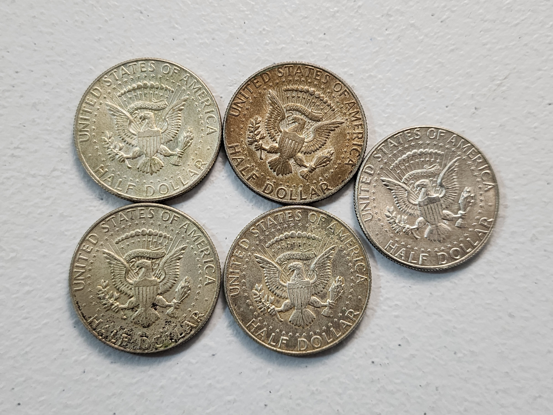 x5 Assorted Years 40% Silver Kennedy Half Dollars FV: $2.50