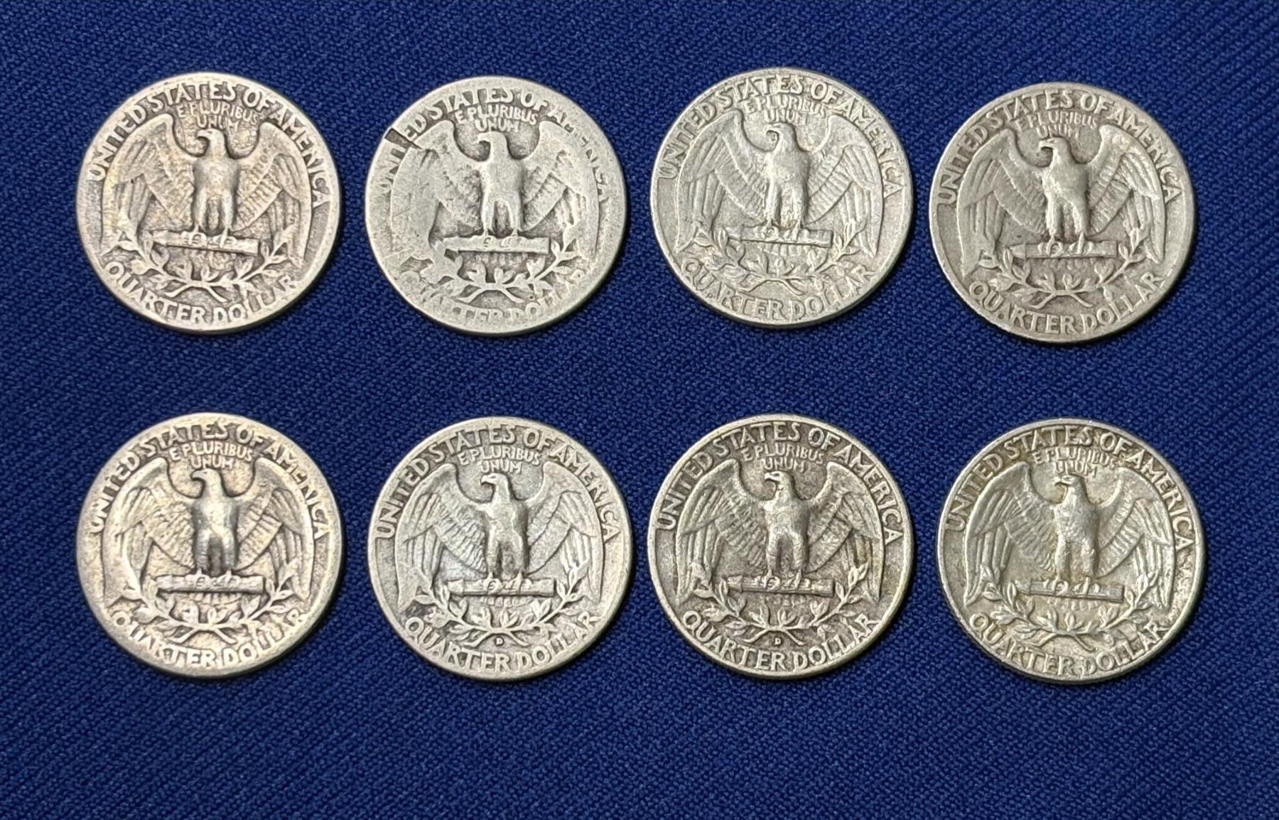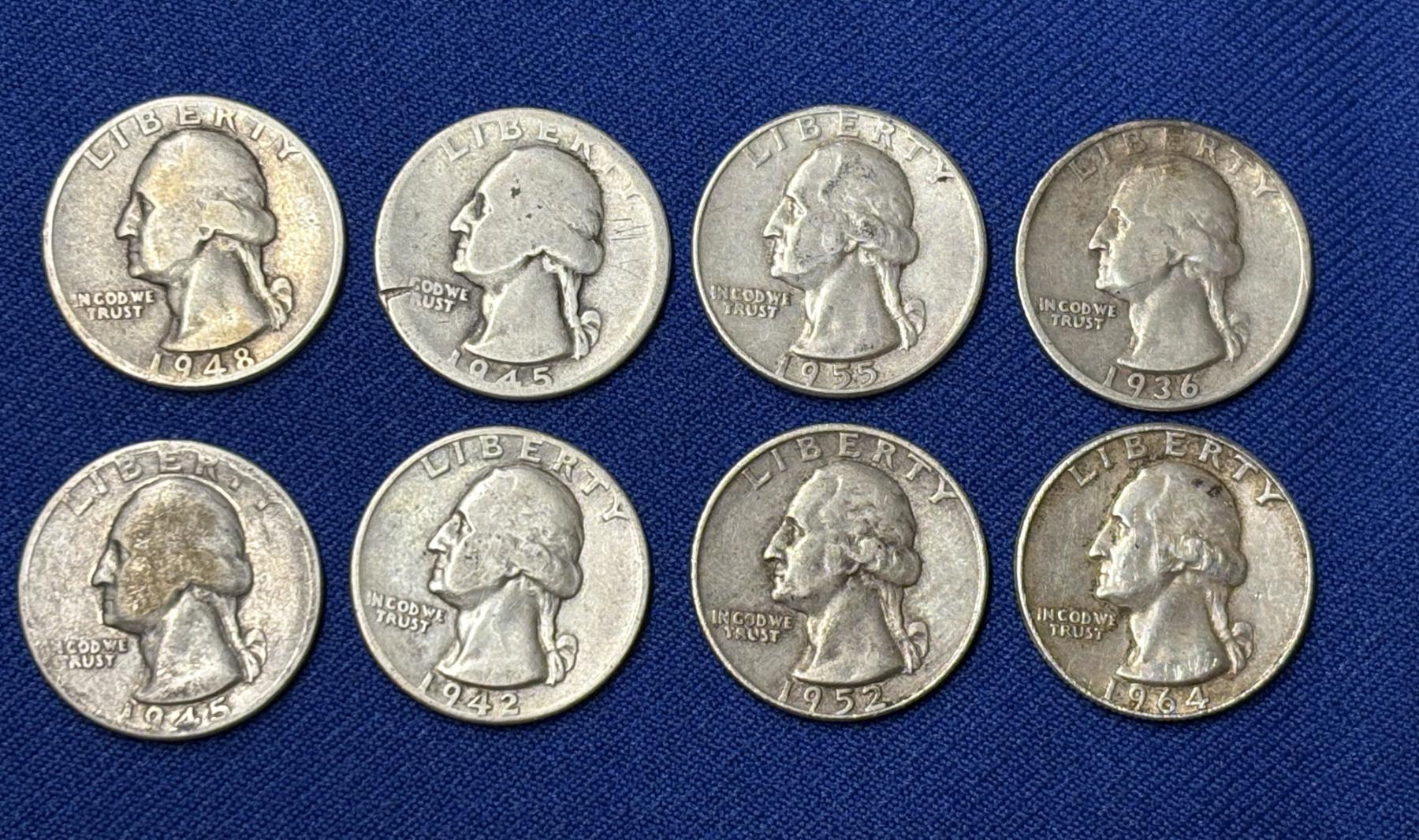 x8 Assorted Years 90% Silver Washington Quarters FV: $2.00